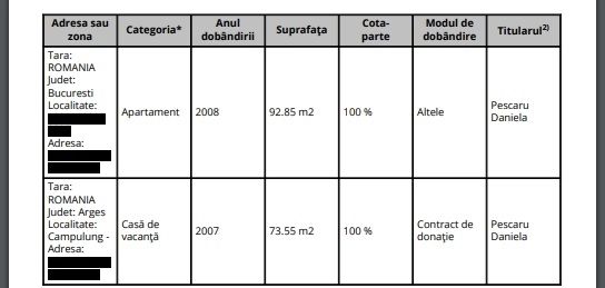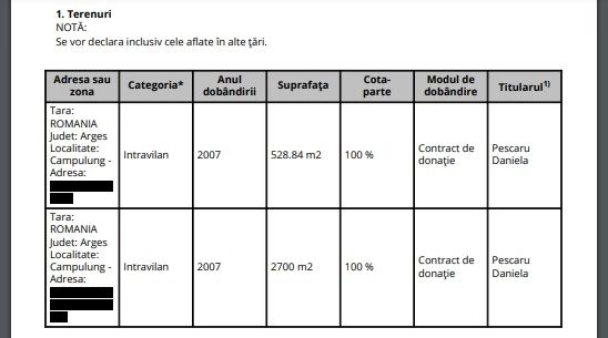 Daniela Pescaru are două terenuri intravilane de 529 metri pătrați, respectiv 2.700 metri pătrați în Câmpulung. Terenurile au fost primite prin donație de la părinți în 2007, la care se adaugă o casă de vacanță în Câmpulung și un apartament în București, și acestea primite cadou, potrivit Declarației de avere 2023.