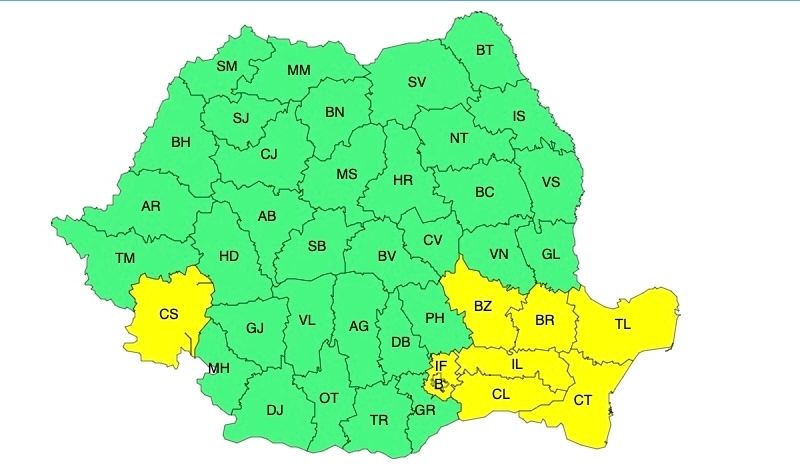 În intervalul menționat, în Dobrogea, în jumătatea estică a Munteniei și în sudul Banatului vântul va avea intensificări, cu viteze la rafală de 50....55 km/h și temporar 60...65 km/h.