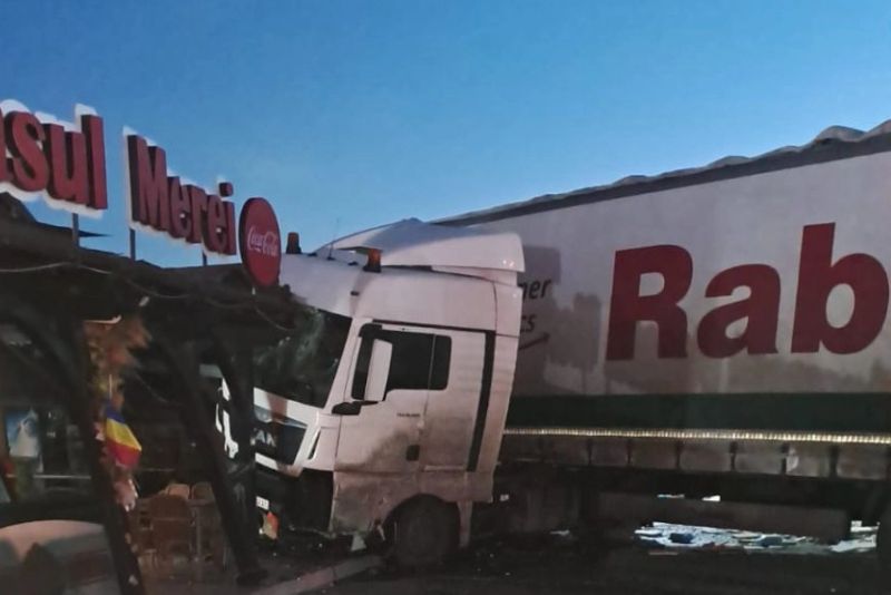 ”Pe DN 1B, în zona localităţii Merei, judeţul Buzău, conducătorul unui autocamion a pierdut controlul direcţiei în rondul de la intersecţia cu DJ 203G, s-a răsturnat, a lovit un autoturism, iar apoi a intrat într-un restaurant”, a transmis, joi, Centrul INFOTRAFIC din cadrul Poliţiei Române.