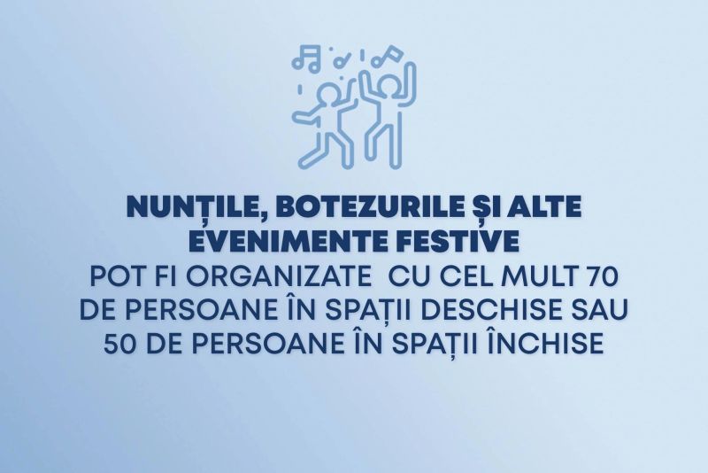 Reamintim că, de la 1 iunie, au intrat în vigoare noi măsuri de relaxare. Românii vor putea face nunți și botezuri, se redeschid cluburile și discotecile, iar suporterii vor putea merge la meciuri. Și copiii vor avea o surpriză, de ziua lor: se vor putea distra, din nou, la locurile de joacă din interior, dar și la piscină. În plus, se renunță la masca de protecție în birourile unde lucrează cel mult 5 persoane, toate vaccinate.