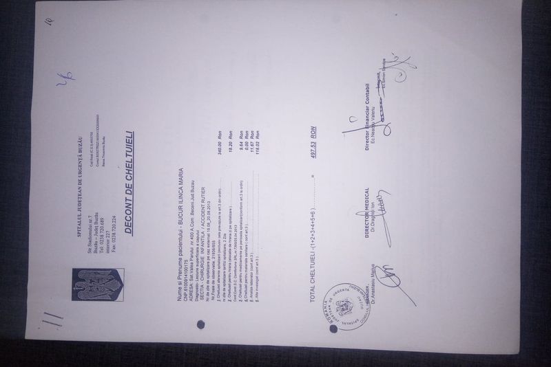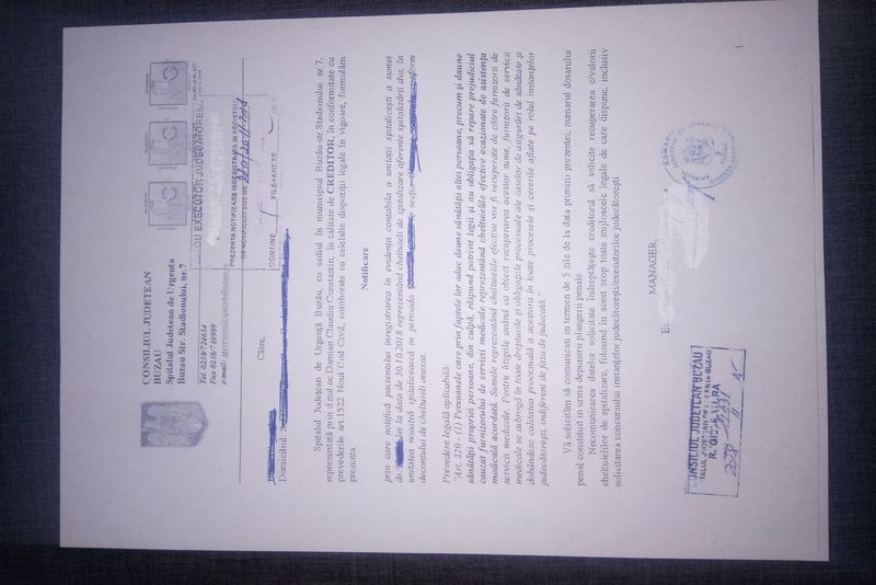 O fetiţă a aflat că ar putea fi executată silit de Spitalul de Urgenţă Buzău, unde a fost internată acum 5 ani. Fetiţei i s-a cerut să comunice urgent numărul dosarului penal deschis după accidentul rutier în care a fost rănită. Fetiţa a aflat că ar putea fi obligată să achite cheltuielile de spitalizare, deşi Constituţia garantează dreptul copiilor la asistenţă medicală gratuităExecutorul judecătoresc a înştiinţat-o pe fetiţa de 8 ani că Spitalul de Urgenţă Buzău a cheltuit aproape 500 de lei pentru îngrijirea sa. Ilinca avea trei ani când a fost lovită uşor într-un accident rutier provocat chiar de tatăl său. Copila a fost internată trei zile la Chirurgie Pediatrică. După cinci ani, spitalul a notificat-o să comunice numărul dosarului penal deschis după accident. Fetiţa este anunţată că, dacă nu o face în cinci zile, spitalul poate apela şi la executarea silită pentru recuperarea cheltuielilor.Poliţia a cercetat cauzele accidentului din august 2013 şi s-a decis neînceperea urmăririi penale.