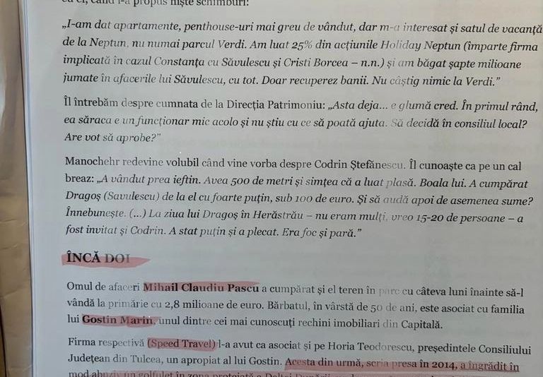 ”In fapt, subsemnatul Dimoftache Razvan declar ca il cunosc pe numitul Gostin Marian de aproximativ 7 ani. L-am cunoscut la generalul SRI Anghel Ion , care mi l-a prezentat ca fiind un apropiat al Serviciului Roman de Informatii si rugandu-ma sa il ajut cu un dosar penal pe care il avea la Constanta, la Parchetul de pe langa Judecatoria Constanta legat de o fapta de tulburare de posesie si/sau distrugere in localitatea Eforie. Aceasta rugaminte a venit ca urmare a faptului ca generalul SRI Anghel Ion aflase despre relatia mea de prietenie cu Prim Procurorul Parchetului de pe langa Judecatoria Constanta in persoana numitului Gigi Stefan Valentin. Arat faptul ca il cunosteam pe generalul SRI de aproximativ 5 ani de la d-na colonel SRI Carmen Duca care fusese ofiter SRI la Sectia Constanta, dupa care plecase prin detasare la SRI Bucuresti. Imi fusese prezentat ca fiind un ofiter superior cu care este bine sa am o relatie apropiata cu atat mai mult cu cat se ocupa de sectorul de ofiteri acoperiti. Prin relatia pe care am dezvoltat-o cu generalul Anghel Ion, am observat ca are o relatie apropiata cu multe persoane din Constanta , intelegand in acest fel ca are multa influenta pe zona, asadar, am acceptat sa ma implic si sa incerc sa-l ajut pe numitul Gostin Marian. L-am intalnit pentru prima data la Constanta , in statiunea Mamaia la un local cu specific romanesc in zona Cazino. La aceasta masa a participat si dl. General Anghel cu familia si mai multe persoane. Cu aceasta ocazia mi l-a prezentat pe cel despre care imi vorbse anterior si am stabilit sa ma intalnesc ulterior in Bucuresti. Urmatoarea saptamana m-am deplasat la Bucuresti unde l-am intalnit pe Gostin Marian la sediul firmei sale din zona Bd. Lascar Catargiu. Acolo mi-a explicat situatia dosarului penal, mi-a inmanat cateva documente si cateva idei scrise de mana ce urma sa i le prezint Prim Procurorului Gigi Stefan Valentin pentru a-l putea ajuta mai usor si a intelege cum se prezinta situatia. Mi-a spus de asemenea ca pentru ajutorul oferit, ii va plati lui Gigi Stefan Valentin o suma de bani, pe care insa nu mi-o amintesc cu exactitate. Cred ca era vorba despre doua sau trei mii de euro. Revenind la Constanta, am discutat cu prietenul meu Gigi Stefan Valentin despre cele ce fusesem rugat, insa nu i-am spus ca interventia provenea de la Serviciul Roman de Informatii pentru a nu-l speria, si l-am prezentat pe Gostin Marian ca fiind un amic. Gigi Stefan Valentin a promis ca se va uita pe dosar si ca vom relua ulterior discutia dupa ce se va documenta.