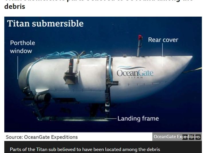 Un expert în misiuni de salvare și scufundări, David Mearns, care cunoaște două dintre persoanele aflate la bordul submersibilului, a declarat pentru SkyNews că resturile găsite lângă epava Titanicului sunt „un cadru de acostare și un capac din partea din spate a submersibilului”.