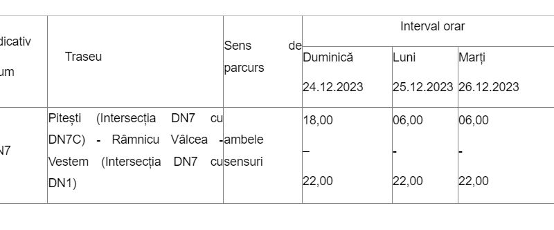 Astfel, în ajunul Crăciunului, vehiculele cu masa totală mai mare de 7,5 tone nu pot circula pe anumite secțiuni din DN7 între orele 18 și 22.