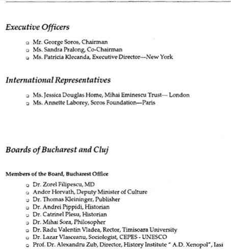 Potrivit primului raport întocmit de fundația lui Soros din România, în funcția de co-președinte se afla Sandra Pralong. Ea a fost consiliera președinților Emil Constantinescu și Klaus Iohannis. Pralong a fost angajată la palatul Cotroceni până la finalul mandatului lui Klaus Iohannis, ea a fost eliberată din funcție la finalul lunii martie de către Ilie Bolojan. Ea s-a ocupat de relația cu românii din afara graniței. Din conducerea fundației Soros în românia ar fi făcut parte și Mihai Șora, unul dintre principalii susținători ai regimului Iohannis și al comunității rezist.