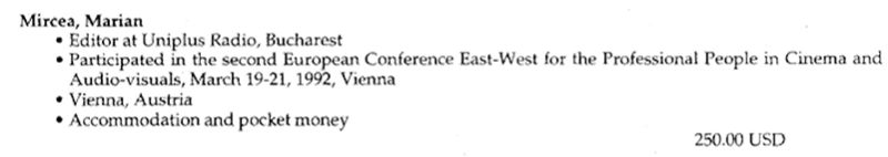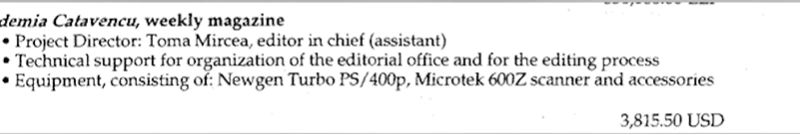 De exemplu, doar pentru o întâlnire Fundația Soros a plătit 275 de dolari cheltuieli de călătorie, plus diurne de 50 de dolari pentru Catrinel Pleșu, Alexandru Lăzescu, Stelian Tănase și Călin Anastasiu.