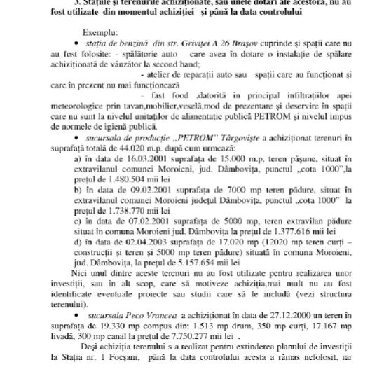 În plus, mai multe terenuri au fost cumparate de societatea Petrom, tot între 1999 și 2000, cu 20 de miliarde de lei, se arată în raportul Curții de Conturi.